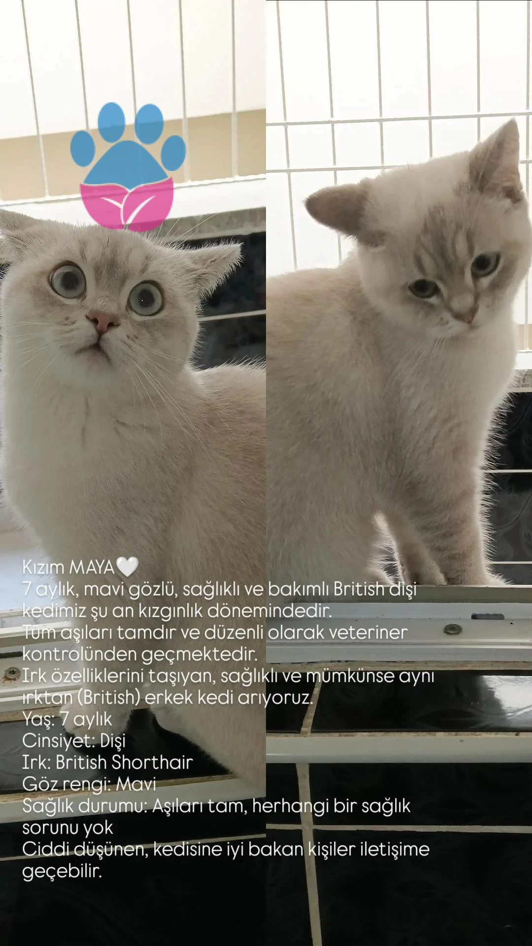 7 aylık, mavi gözlü, sağlıklı ve bakımlı British dişi kedimiz şu an kızgınlık dönemindedir. Tüm aşıları tamdır ve düzenli olarak veteriner kontrolünden geçmektedir. Irk özelliklerini taşıyan, sağlıklı ve mümkünse aynı ırktan (British) erkek kedi arıyoruz. Yaş: 7 aylık Cinsiyet: Dişi Irk: British Shorthair Göz rengi: Mavi Sağlık durumu: Aşıları tam, herhangi bir sağlık sorunu yok Ciddi düşünen, kedisine iyi bakan kişiler iletişime geçebilir.